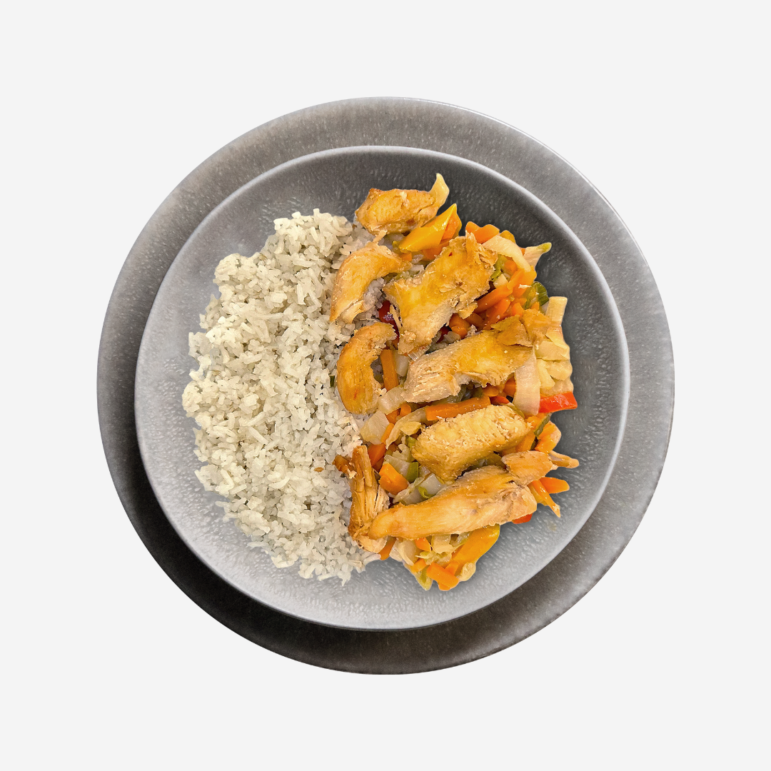 Hühnerstreifen mit Wokgemüse und Basmatireis