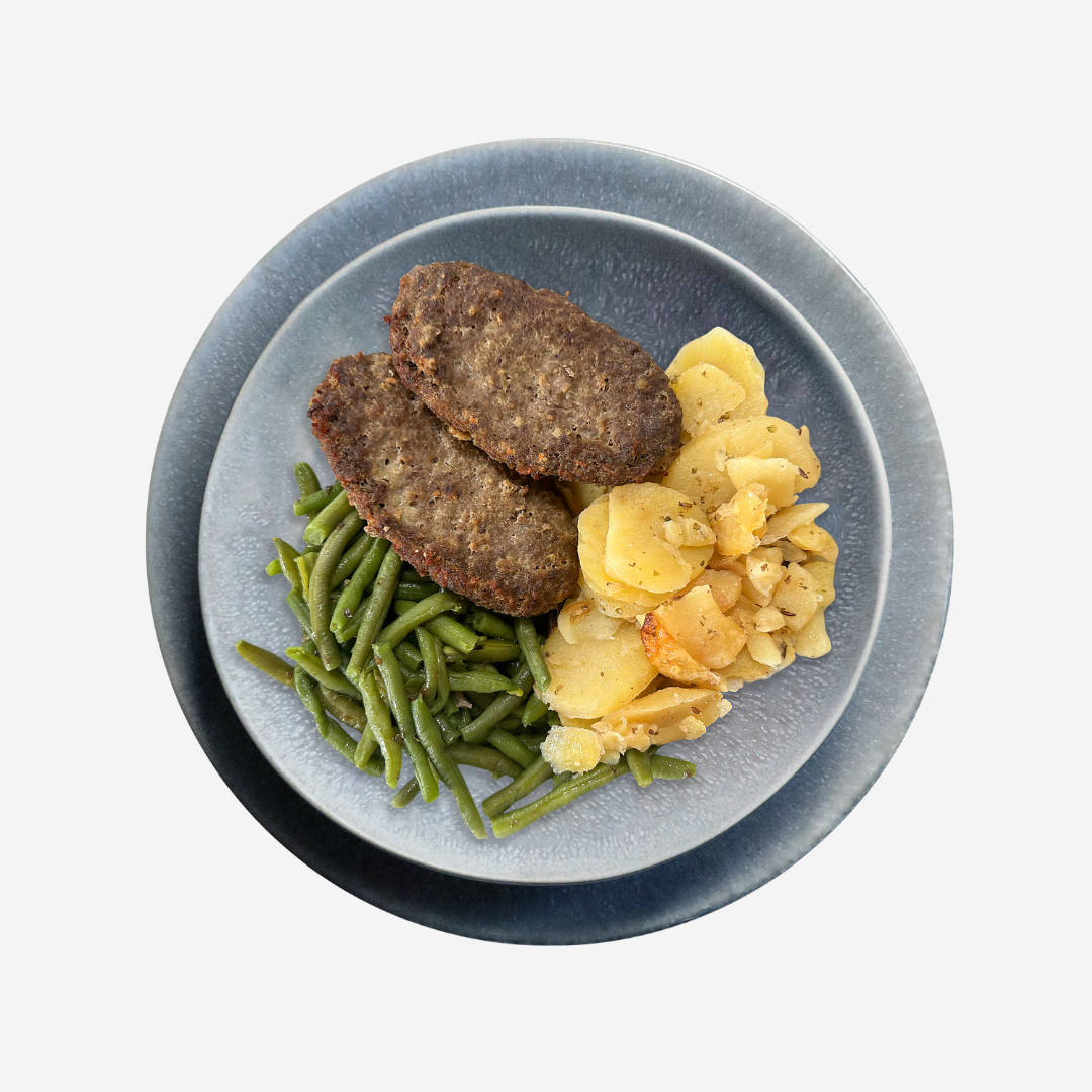 Faschierte Laibchen mit Prinzessbohnen u. Kartoffelschmarr´n